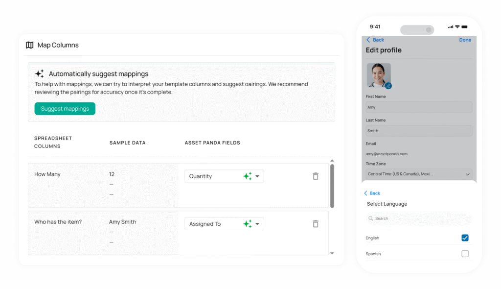 Avoid duplicate work and data cleanup by quickly uploading your assets with AI-powered column mapping. Empower your users with AI translated versions of the platform.